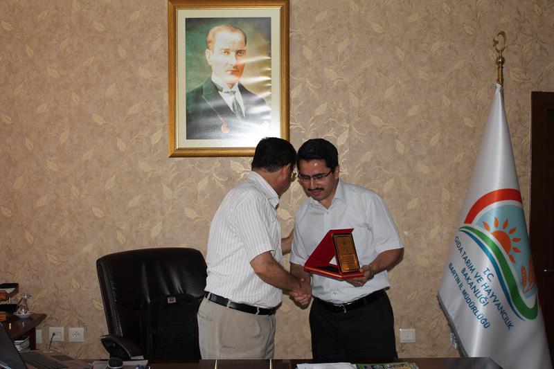 İl Müdürümüz Abdulseter BAYRAM'ın odasında gerçekleşen Plaket takdiminde Bartın Öğretmenevi Müdürü Ali SİLAHDAR " Bartın Gıda Tarım ve Hayvancılık İl Müdürlüğü bu süreç içinde bize daima rehberlikte bulunmuş, işletme kontrolleri, hjyen eğitimleri ve personel bilgilendirilmesinde yardımlarını esirgememiştir." dedi. İl Müdürümüz Abdulsetter BAYRAM'da "Bartın Öğretmenevi Müdürlüğüne çok teşekkür ediyorum. Bu süreçte Türkiye'de 1. seçilmeniz bizi de en az sizin kadar mutlu etmiştir. Çalışmalarınızda her zaman kurum olarak üzerimize düşenleri yapmaya hazırız. Başarılarınızın devamını diliyorum" dedi. Ardından Bartın Öğretmenevi Müdürü Ali SİLAHDAR tarafından plaket takdimi gerçekleştirildi.